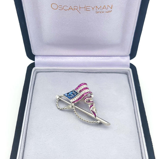 92-34 | Platinum OHB Small Flag Pin with Rubies: 0.76ct, Diamonds: 0.26ct, Sapphires: 0.61ct